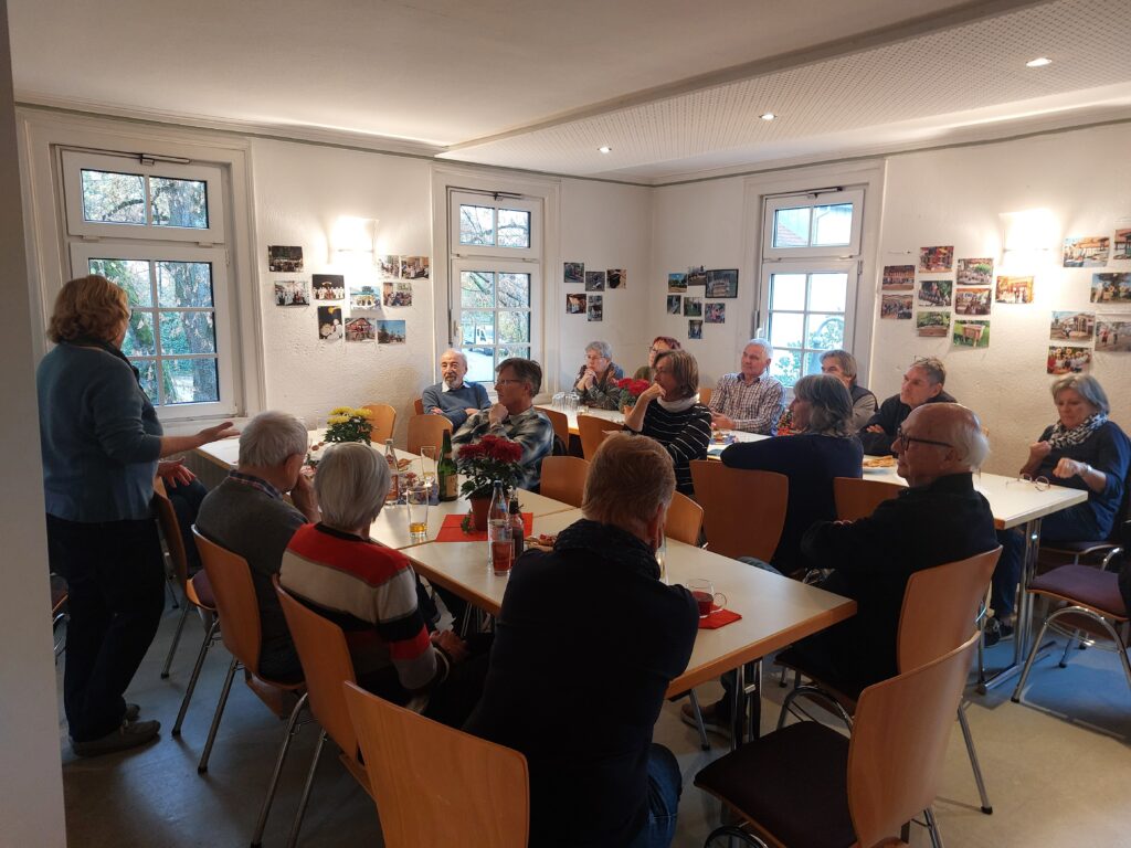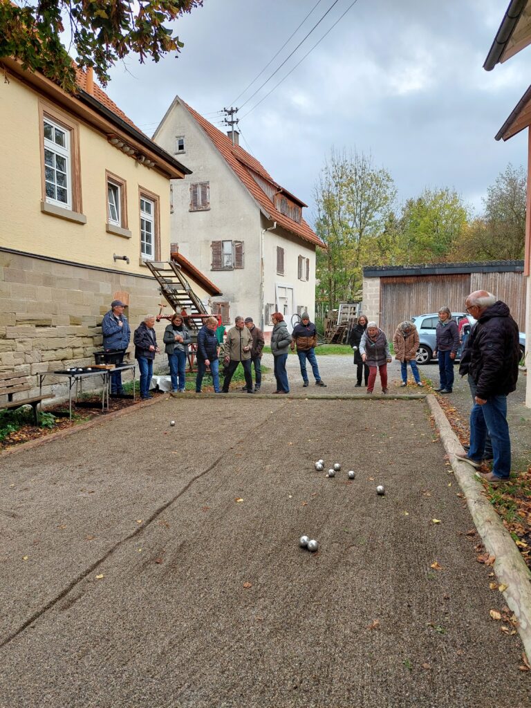 Obwohl das letzte Oktoberwochenende ziemlich wechselhaft, nass-kalt und windig war, konnten wir am Sonntag, 26.Oktober 2025 unsere diesjährige Boulesaison wie geplant mit letzten Partien und einem kleinen Imbiss im Rathäusle gesellig ausklingen lassen. Zu unserer großen Freude waren zahlreiche Vertreterinnen und Vertreter des Heimatvereins Weissacher Tal unserer Einladung gefolgt, den diesjährigen Bouleabschluss gemeinsam mit uns zu begehen und so den Austausch zwischen beiden Vereinen lebendig zu halten. Nach einem Sektempfang und einer Begrüßung durch Helge Husfeldt in seiner Funktion als 2. Vorsitzender unseres Vereins, machte eine Regenpause gegen 15 Uhr tatsächlich das Bilden von vier Mannschaften möglich, die sich auf der mittig geteilten Bahn spannende Boulepartien lieferten. Die Mitglieder beider Vereine mischten sich dabei wunderbar und einige Gäste absolvierten dabei mit Bravour ihre Boulespiel-Premiere. Weiter ging es danach wieder im Rathäusle mit einem Bericht über die Konzeption und Entstehung des Heutensbacher ErlebnisStationenPfads durch Elke Brünle und Christiane Hillig. Den Abschluss bildete schließlich ein kleines französisches Buffet mit allerhand Käse- und Wurstleckereien und anregenden Gesprächen bis in den frühen Abend.